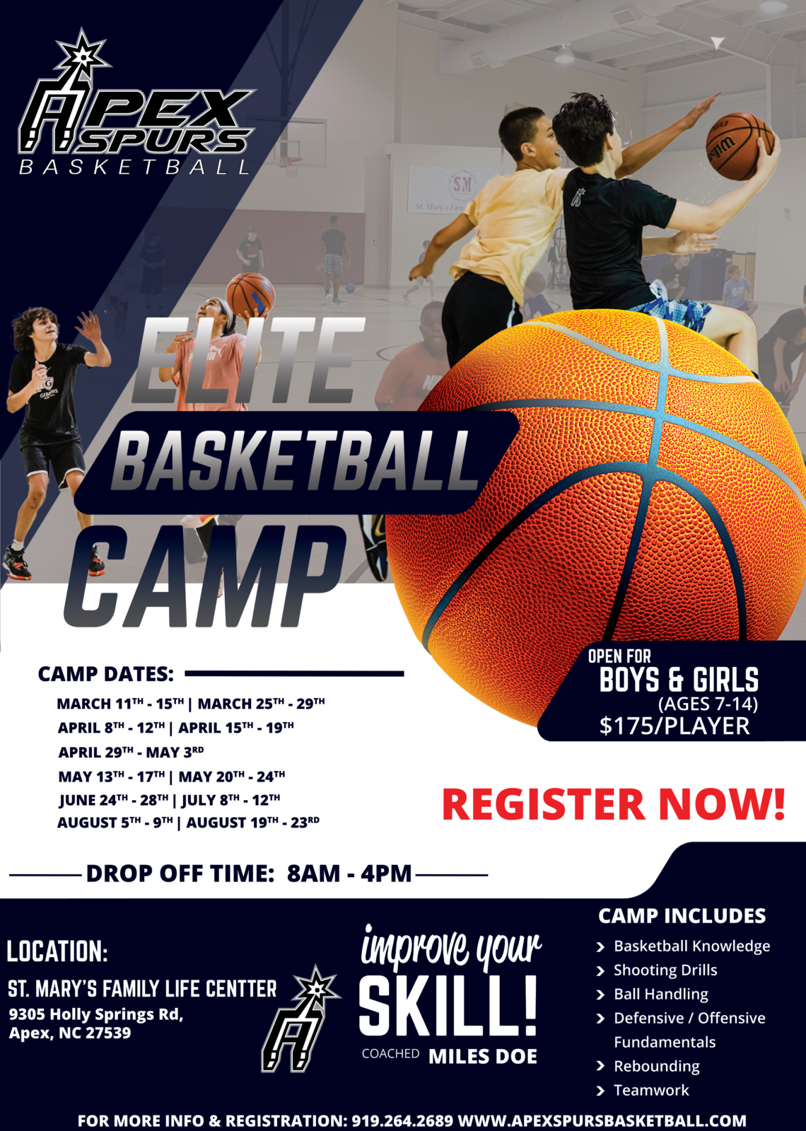 Apex Spurs Basketball is extending this personal invitation to all students in our surrounded area to our 2024 Elite Basketball Camp.